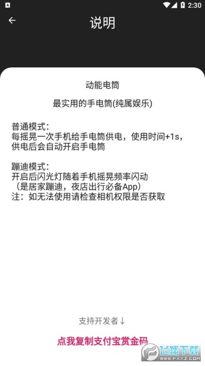 普通模式:每摇晃一次手机给手电筒供电,使用时间+1s,供电后会自动开启手电筒