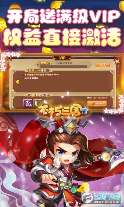 《不朽三国-天天送充抽》是一款以三国为背景的3D卡牌手游,上线就送满VIP,元宝*88888,金币*288W,体力*500,琼浆玉液*10,免费月卡*1,10次10连抽,每日登入得神将,栖身三国世界,由你搭配最强牌组,称霸三国世界由你带头。