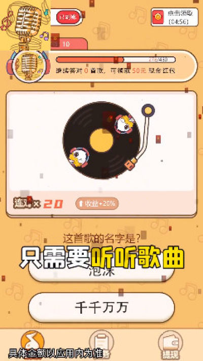 《这是什么歌》每天上线打卡都可以领取随机的红包奖励,无门槛兑现的玩法,1元也可以兑现!这里的歌曲非常的多,只要猜对这首歌的名字你就可以领红包了!