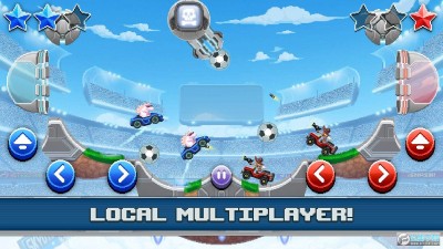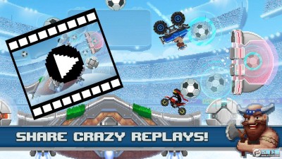 玩家将驾驶摩托在特技场地中进行撞头比赛,你需要在加速的轨道上调整自己的位置,在飞起后尽量撞击对手的头部来赢得胜利!游戏支持与机器对战也支持玩家间双人对战。玩家操控赛车,与对手战斗,目标是将从空中坠落的足球射入对方的球门!同时,玩家还可以不断强化自己的赛车,增强赛车的各项性能,让自己更加容易战胜对手!