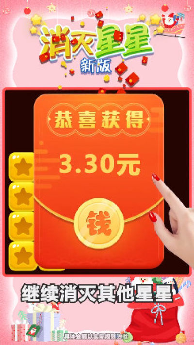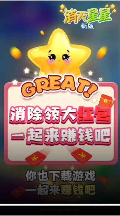 《消除星星疯狂版送红包手游》全新消灭星星的手机游戏,糖果风格,画面Q萌可爱,玩家在游戏中每次消除都有机会获得红包奖励哦!反复提现,奖励无限,快乐无穷!感兴趣的小伙伴们赶紧下载体验吧!