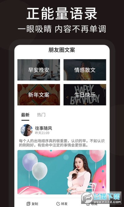 2021朋友圈顶尖文案工具是款不错的手机文案工具,开启之后我们就能利用工具发出各种精美文案帮助用户们更好的发出朋友圈。软件安全可靠很是好用,并且超多精妙文字等待大家前去观看和尝试,需要的朋友不妨速速下载吧