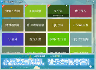 小呆装逼神器是一款恶搞装逼的修改工具,主要是针对QQ的业务信息,支持我的钱包、财付通、QQ资料等信息进行修改,功能强大模仿性极高,欢迎有需要的用户下载使用!