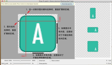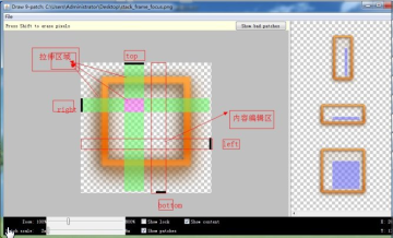 注:一个通常的png文件(*.png) 加载时,将以一个空的单像素边界补充在图片周围,你可以在里面画可延伸宫格和内容区域。一个前面保存的九宫格文件(*.9.png)将以原样加载,因为这个已经存在。