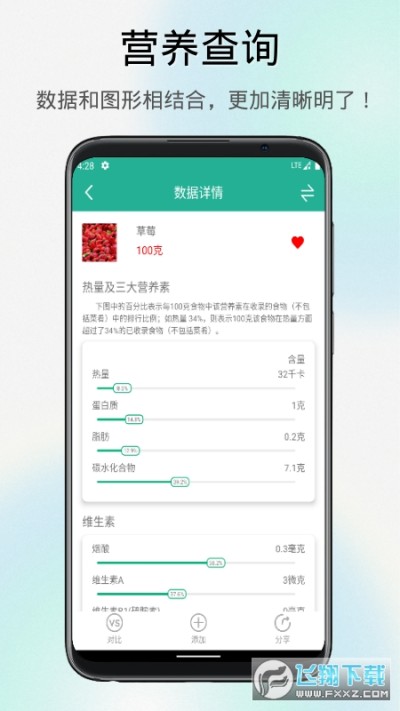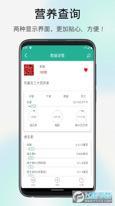 两种不同的界面来展示食物的营养素数据信息,更能帮助用户了解食物营养素的含量对自己身体的影响!