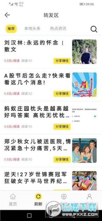 2、登陆成功后,点击“转发”频道任选一篇文章转发到微信,转发被点击阅读的次数越多,赚的也就越多