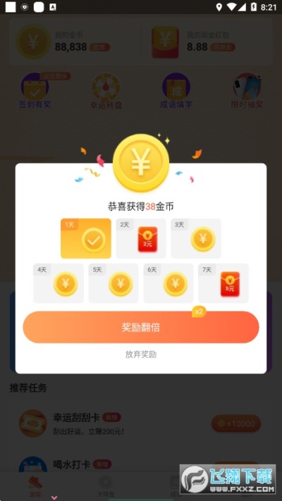 用户通过完成各种各样的任务来赚钱金币、红包。