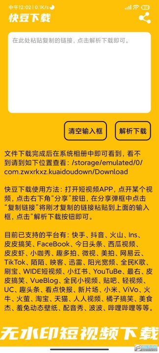 快豆下载app是一款最新的视频去水印下载软件,软件支持广大短视频主流视频平台视频解析,软件用法简单易上手,复制视频链接粘贴即可进行解析,一键帮助用户去除水印内容,对软件感兴趣的话不妨点击下载试试!