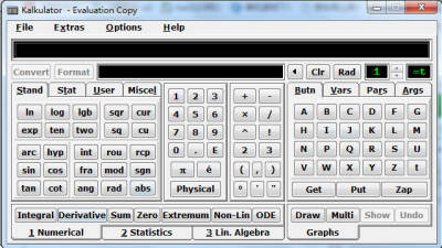 Kalkulator 具有功能面板、数字面板、操作符面板、变量面板、应用面板及图形面板等几大控制面板,使你的操作更方便。提供了大量的科学计算功能,含标准功能(如三角函数、对数运算等)、统计功能、扩展功能及用户功能(允许用户定义自己的操作功能)。支持变量参加运算,你可以定义变量,并向它赋值,具有多项式运算功能。支持角度和弧度运算,运算结果可以在多种格式间转换,你可以根据需要转换结果的格式。