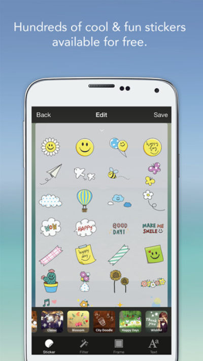 - 照片贴纸:来自多名艺术家制作的上百种贴纸可供使用。贴纸包含了非常多的样式,分别有涂鸦、卡通、可爱风、大头贴、装饰物以及精美艺术作品等。