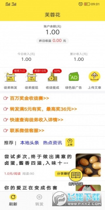 1、上线当天下载注册芙蓉花app就送1元,转发文章单价1元/阅读,支持上传文章