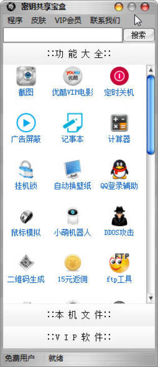 密钥共享宝盒(密钥共享遨游器)是一款非常实用的多功能综合工具箱,工具箱搜索框支持搜索工具箱内文件,支持百度搜索,非常的给力,用户还可以根据自己的喜欢切换皮肤,设置开机启动!等。。。软件主要有三大模块。其中包括:功能大全、本机软件、VIP软件。