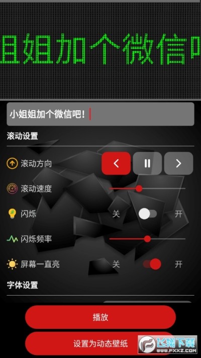 ScrollerLED v1.2.3专业破解版是一款安卓手机LED跑马灯工具,让手机变成会滚动字幕,在很多场景能使用到同时也会挺好玩的、我就输入表白文字用来表白妹子,同时APP还可以多彩手绘荧光字,有艺术小伙伴可以试试!支持字体颜色非常全,你只需要输任何你想表达的文字!
