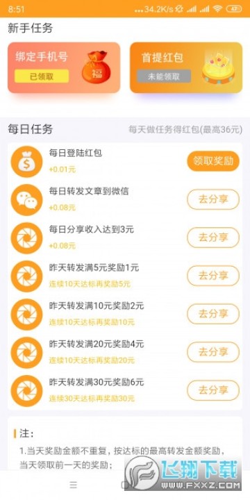 3、指橙资讯转发平台每日转发收益满5元起可获得1元额外的现金奖励,连续10天达标再奖5元,转发满30元奖励6元,连续10天达标再奖30元