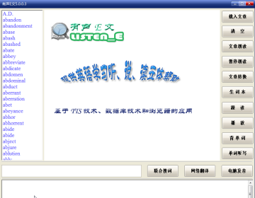 有声E文是一款功能全面,使用简单,教学资源丰富的基于事件驱动文本语言转换(即TTS)、数据库技术和web浏览器应用的英语学习帮助软件。旨在提供英文文章的语音即时合成,制作有声的英文文章音频,生词的本地及在在线检索,跟读及背单词功能。提供在英语学习过程中的听、说、读方面全面帮助。