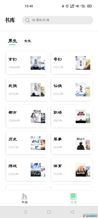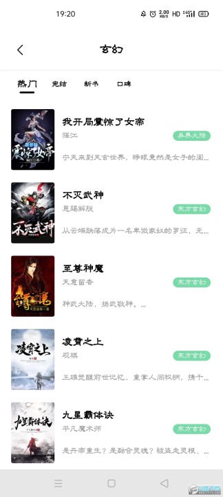 书库针对用户分成男、女两个模块,下属分类也很详细,点进任意一个可以看到:热门、完结、新书、口碑这四种排行。