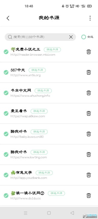 直接搜索的话也会推荐一些热门书籍,点击搜索框右侧的按钮就可以进入我的书源,可以看到超多书源,最常见的笔~趣~阁也在其中哦! 如果不喜欢还可以取消选中,就不会搜索到该来源了。