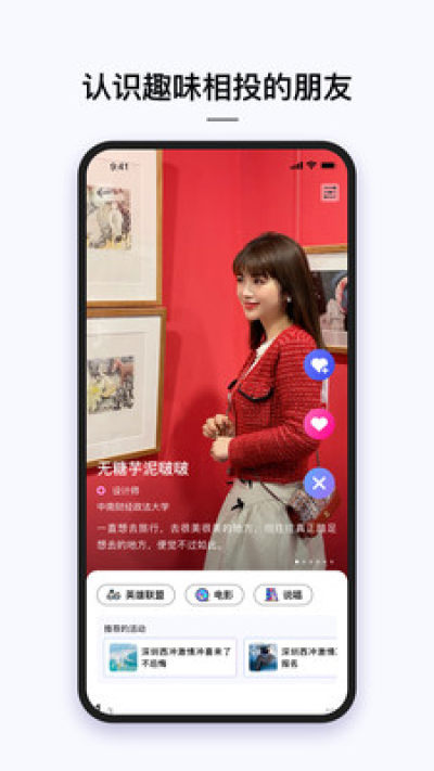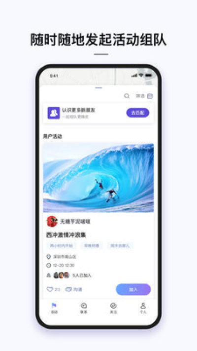 使用”好友匹配“功能,发现更多更潮的活动达人,与他们一起线上沟通,线下畅玩吧