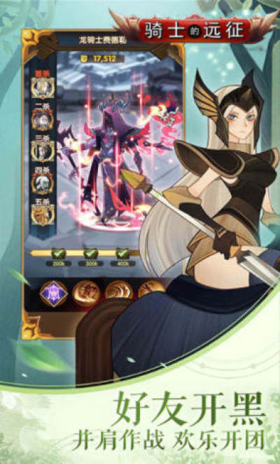 《骑士的远征》创角即送648元充值卡,副本,签到无限领取充值卡。一款欧美风的回合制魔幻挂机游戏。上线即送VIP15,创角即送8888钻石,更有无限充值卡等你拿!游戏内有酷炫的坐骑、绚丽的翅膀,各种强力的宠物可以帮你勇斗恶兽,招募英雄一同并肩作战;更有超强战力的战将助你铲除邪恶;恶龙已经咆哮肆虐,赶紧行动起来吧,未知的世界正等你来探索征服。