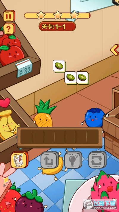 点击选中果蔬,然后再点击另外一个同类果蔬,如果两个果蔬可以通过不超过三根线连接,则他们可以被消除;在特定时间内消除所有动物即可通关。
