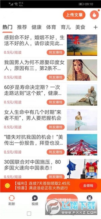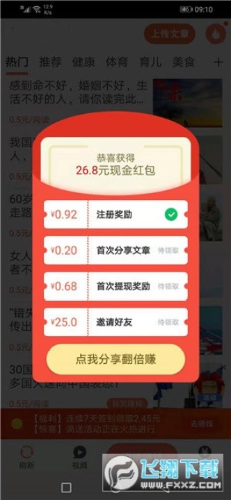 2、登录成功后,点击“转发赚钱”或者“视频”页面任选一篇文章/视频转发到微信,被有效阅读后即可获得奖励