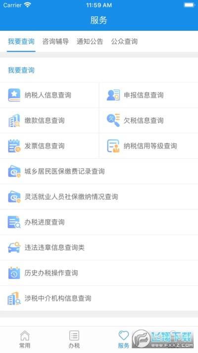 三、我要查询:办税指南助您了解办税流程和所需资料等;大厅实况让您实景查看各办税厅排队情况,避开拥堵高峰;进度结果让您快速查看税费事项办理进度,也可扫描查看电子缴款凭证信息;征期日历提供每月征期查询;帮您算税为您计算有关税费缴纳信息;纳税信息方便您随时查看税费缴纳情况;发票真伪提供发票代码(号码)、查询码、二维码查询服务,可查出发票的详细信息,维护消费者权益;我的下载:常用涉税费文书和操作指南文档查阅等。