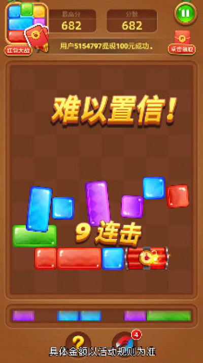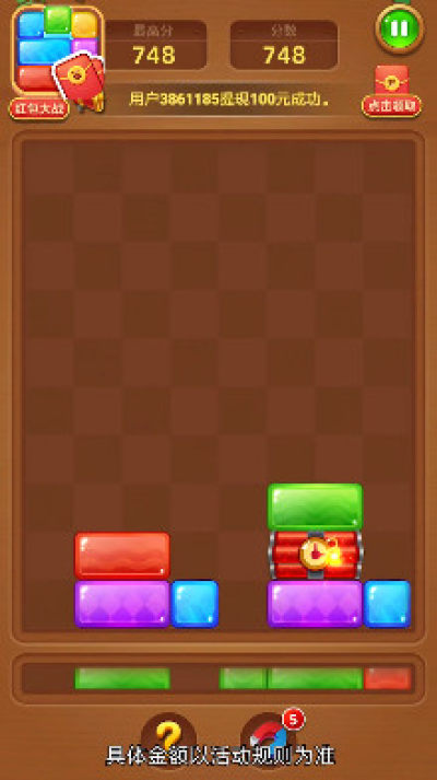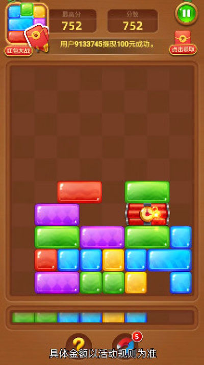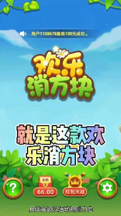 欢乐消方块是一款高度自由的方块模拟消除类手机游戏。用户既能在欢乐方块消除领红包这里体验到消除游戏的乐趣,又能获得很多的红包奖励,特别适合在无聊的时候玩。丰富的关卡,用户随时都能闯关,只要你成功闯关就能领取红包。