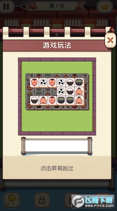 点击榻榻米上的方块元素,并将3个相同的元素放置到卷轴上即可消除。消除完该区域内所有方块即可获胜!如果卷轴上有7个以上的方块,游戏将结束。