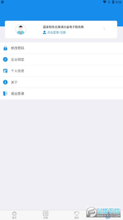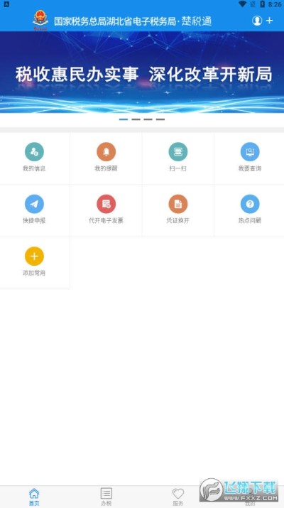 楚税通”分为“首页”“办税”“服务”“我的”四大模块。其中: