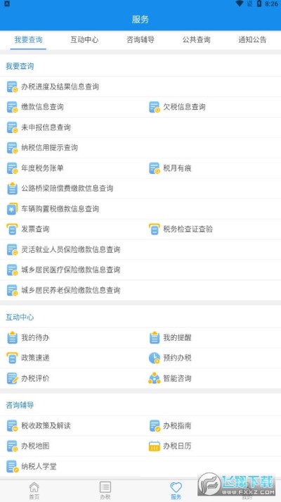 “服务”模块用于税费信息查询及税费政策咨询辅导,包括税费信息查询、互动中心、智能咨询等功能;