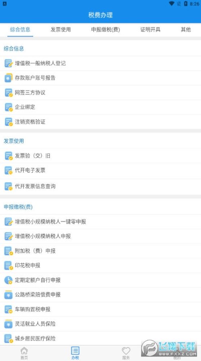 “办税”模块用于涉税费业务办理,包括税费申报、缴税缴费、发票开具、证明开具等功能;