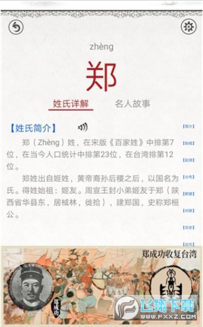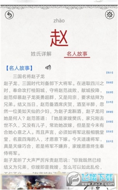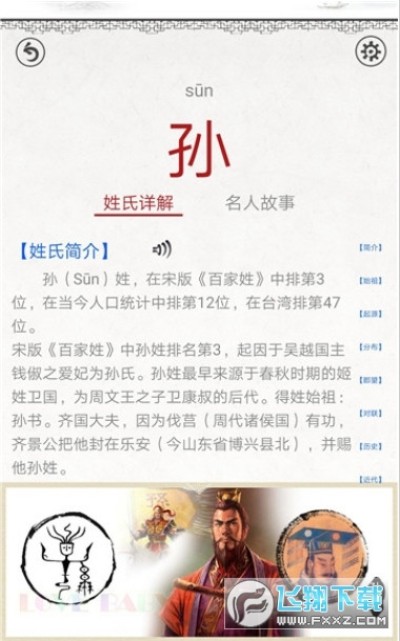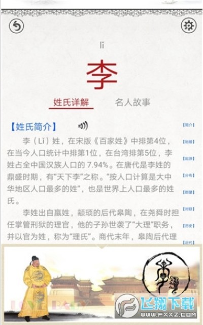 百家姓图文app里每个姓氏汉字都有读音、释义、繁体、和相对应的名人故事。