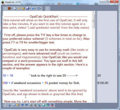 自然语言计算器(OpalCalc)是一种功能强大,操作界面较为复杂的免费办公学习软件。相较与普通的计算器,它省去了我们事先对事件数据的处理过程,使用习惯过后就感觉非常方便。符合自然语言标准的计算器,使用起来略略复杂,更适合小众用户使用,当然拿来练习外语也不错!