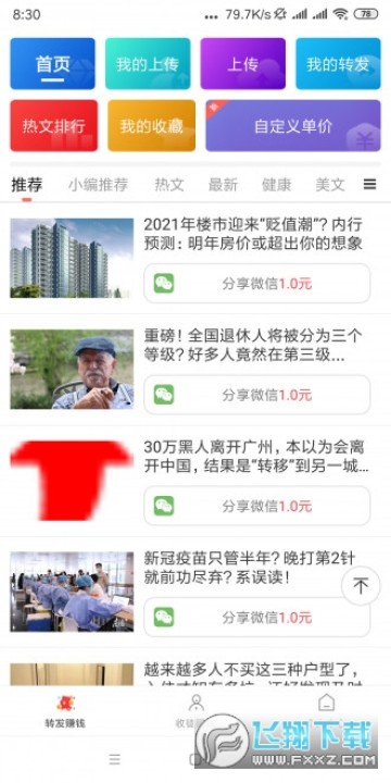 2、登录成功后,点击“转发赚钱”选择感兴趣的文章/视频转发到微信,被阅读即可获得相对应的转发酬劳