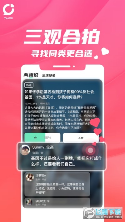 YesOK软件安卓版是一款脱单社交平台,这里汇聚了各种各样的帅男靓女,同时在这里还有各种各样的社交玩法,通过语音、视频来认识对方,在YesOK上你还能组建线下的相亲活动,大家一起玩一起嗨,说不定就脱单了哦!