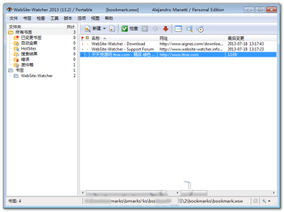 使用之前,你首先需要设定需要跟进的网站地址,在书签中使用新建功能就可以了,链接地址可以是网站地址,如www.ttrar.com,或者是某一个特定网页的地址。之后,你的所有工作就完成了,交给WebSite-Watche吧。
