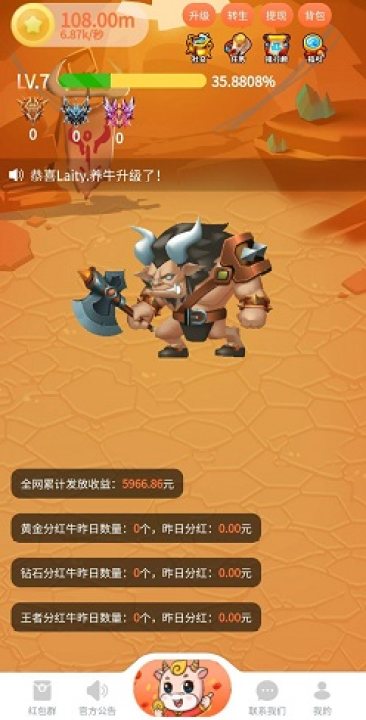 上图是官方给出的玩法,养牛分红这里,就是点击“任务”进入看广告,签到。经验值满后点击“升级”。但根本不知道能分红多少钱,这里也有提现功能,和红包群是分开的,首次0.3元提现。怕麻烦的,每天就在红包群看广告领红包,凑到提现门槛就提现。理论上,每个人能赚个几十,实际上,很多中途放弃,忘记,规则更改,别说几块,可能有人就赚个几毛。