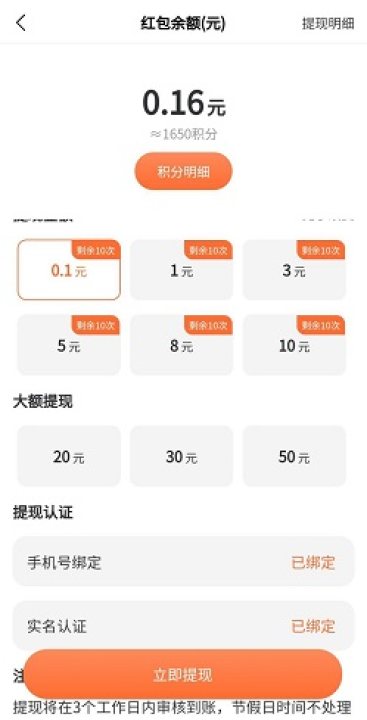 3.满0.1元就能提现,每天可以提现3次,秒到支付宝!(需要绑定手机号,实名就是填姓名和支付宝)