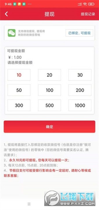 3、银河涨满10元起提现到微信钱包,首次秒到账,后续24小时内审核到账,每人每天限提一次