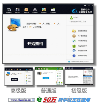 本系统可用于学籍相片、学生证相片、工作证相片、(中考、高考、学业水平考试)报名等相片的采集,摄像过程操作简单便捷,采集时不用因为学生的身高而去移动照相架,可在相片显示区选择“取相框”即可,可自定义设置。