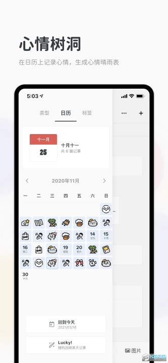 心情:记录当下心情,除系统的 Emoji 以外,我们还提供了一套精美的专属心情贴纸。