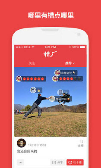 槽厂是一款非常有趣的手机交友软件,大家可以在这里发布各种搞笑的图片,并附上幽默的文字进行恶搞和吐槽,同时还可以分享到微信、朋友圈和微博等社交平台,非常的有意思,感兴趣的朋友快加入进来一起吐槽吧!
