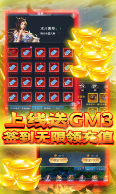 1.创角赠送GM3特权,首日签到送GM4、188000元宝、888.8万金币