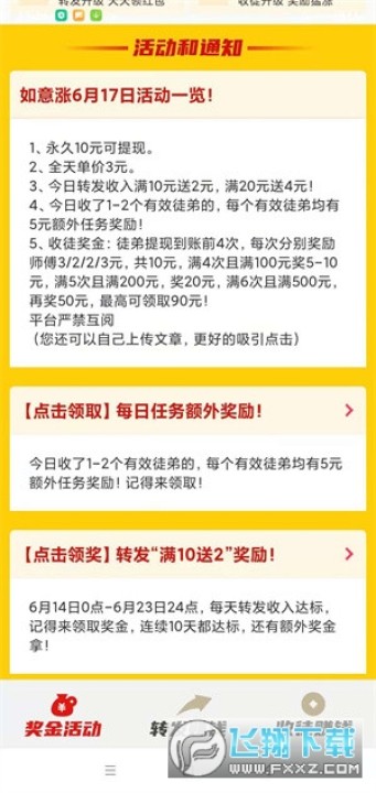 3、如意头条除了常规的转发文章赚钱以外,当你每天的转发收入满10元起还能领取额外的现金奖励,转发收益越多领取的奖励也越高
