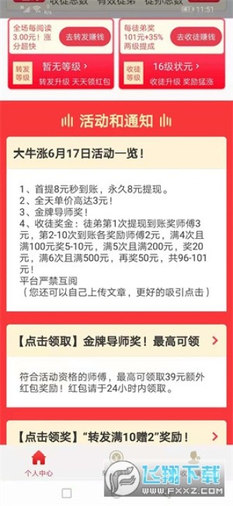 1、新用户下载注册大牛头条app就送1元,转发文章单价全天3元/阅读,还可以自己上传文章,更好的吸引点击