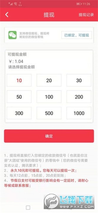 3、团结头条永久满10元起提现到微信,首次秒到账,后续24小时内审核到账,每人每天限提一次
