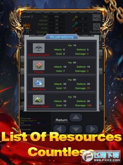 1,游戏玩法简单易上手,玩家在游戏中将成为一名为了拯救公主,勇闯魔塔古堡的勇士。