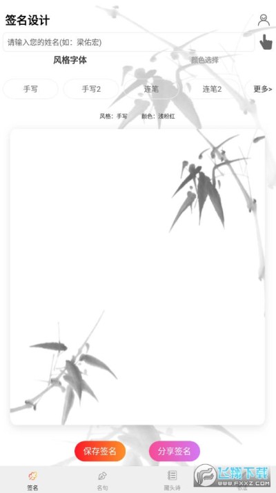 字体签名设计软件是一款很好用的手写字体签名设计软件,现在人出门签名就是一个人的脸面,怎么样才能好看又有内涵呢,这就需要专门的签名设计了,这款字体签名设计软件可以免费帮你设计前面,提供各种字体模式,快来下载试试吧!