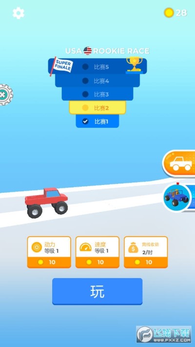 驾驶不同类型的汽车进行行驶。《疯狂小汽车小游戏》中玩家驾驶卡车来闯关冒险,玩家可以通过上线的滑动来改变卡车的轮胎大小,以应对不同的路况,平路上,轮胎越小速度越快,而在越过障碍物的时候就需要大轮胎来帮助你通过了,简单的控制操作,赚取金币解锁更多汽车模型与颜色,赶快下载体验吧!