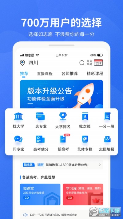 如志愿软件提供名师在线课堂,百位名师直播随时可以在线学习,海量题目助力提分,并且如志愿app还有专家一对一提供志愿填报服务。